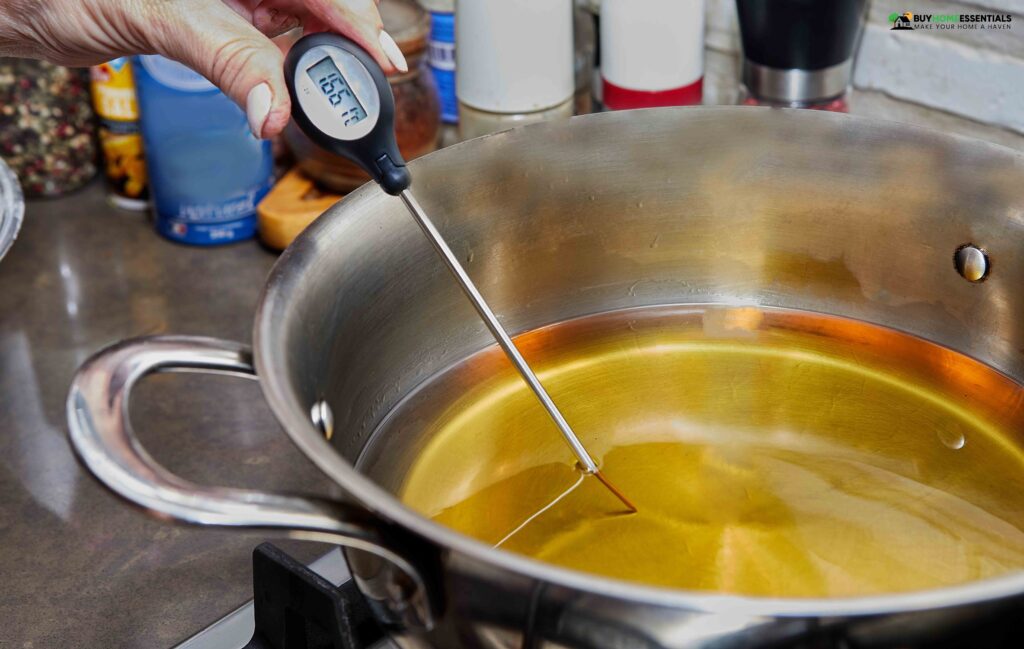 The chef checks the temperature of the heated oil in the pot on the gas stove with the thermometer.